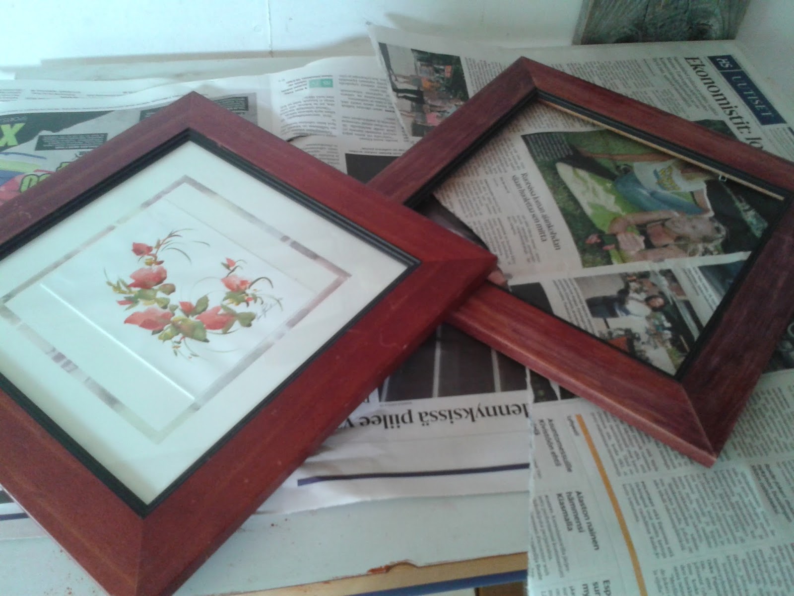 No ei muuta kuin kirppareille taulunkehyksiä ostamaan. Helposti löytyivät ja sen jälkeen soittelin miniälle, joka ei enää tuota hääjuhlaa ennen ollut miniäkokelas vaan ihka oikea, että passaako hopea vai mitä värejä kehyksiin laitellaan. Sain ns. vapaat kädet, kunhan vaan pitäytyisin melko neutraaleissa väreissä. kassissa oli siis ruskeat, keltaiset, vihreät ja oranssit kehykset... Mentiin ostamaan hopeaa spray-maalia, hopeahilettä ja mustaa maalia, jolla omin kätösin ajattelin maalata hääparin nimikirjaimet taulunkehysten sisään.
